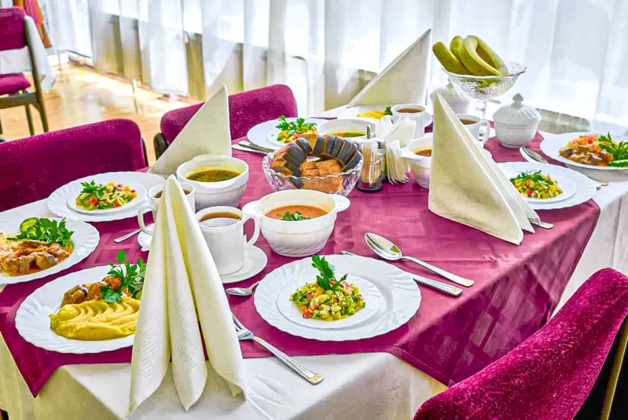 Программа питания в санатории построена на базе диеты по Певзверу. Это значит, что гостям предлагаются лечебные столы (диеты), которые показаны при том или ином заболевании.